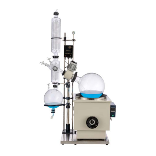 蒸發(fā)瓶恒速旋轉(zhuǎn),水浴鍋恒溫加熱,在此條件下:物料在蒸發(fā)瓶?jī)?nèi)壁形成大面積均勻薄膜快速蒸發(fā),在真空條件下可以提高蒸發(fā)效率(需連接真空裝置),溶媒蒸汽經(jīng)玻璃冷凝盤(pán)管時(shí)冷卻成液體(需連接冷卻裝置),回收于收集瓶。